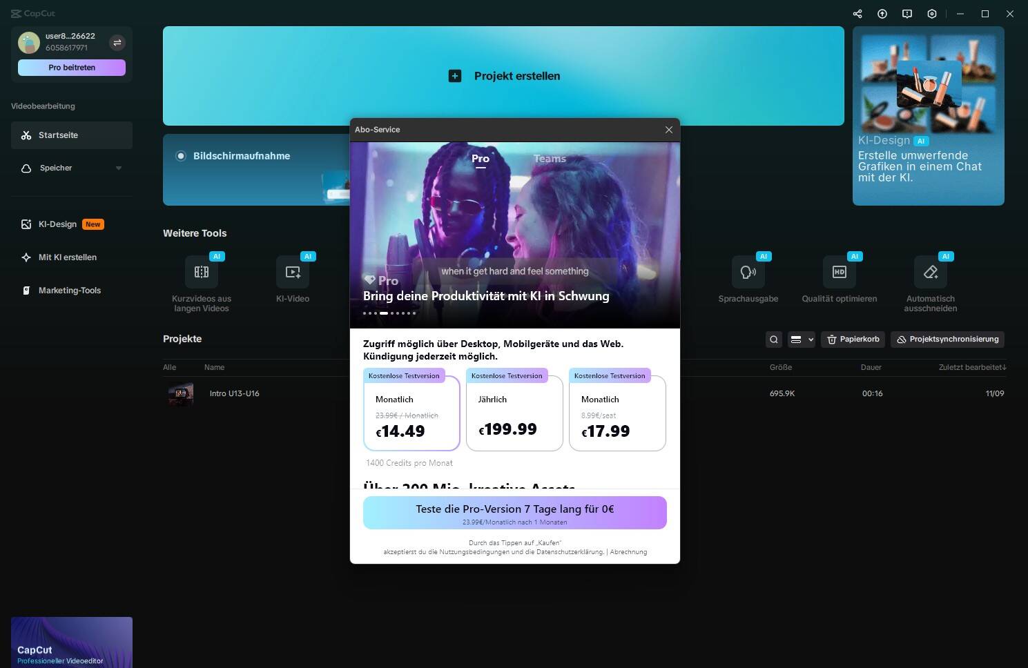 In der PC-Version von CapCut wird bei normalen Pro-Abos der Button oft durch die “7 Tage kostenlos testen”-Option ersetzt.