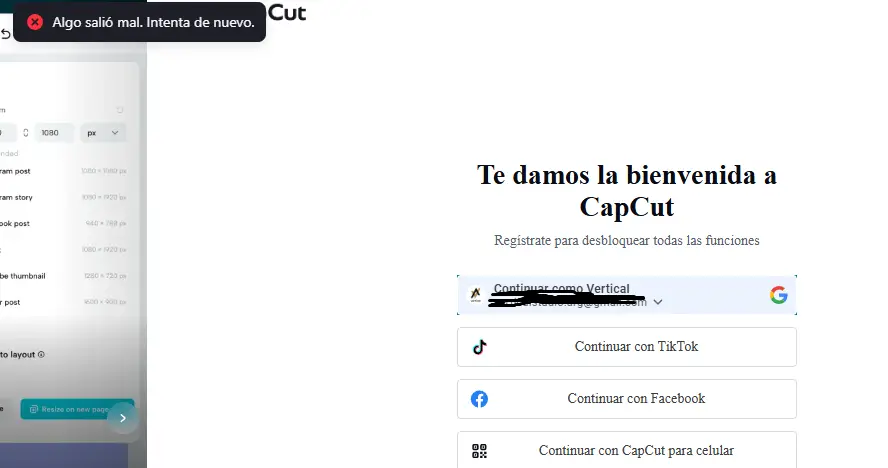 Intentá abrir CapCut en modo incógnito (navegador) y acceder con el método con el que originalmente te registraste (Google/TikTok/Facebook).
