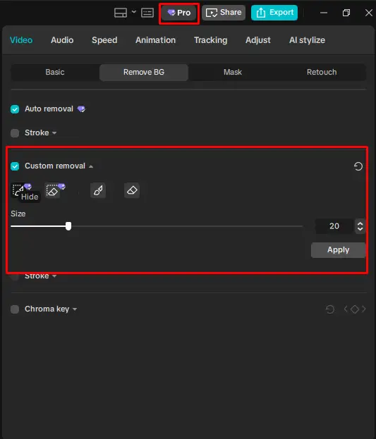 In the screenshot, we can see the “Custom removal” section in the Remove BG tab of CapCut Pro, and you are saying that only the “Size” slider appears, while other options (like brush, erase, restore, or region tools) are missing or grayed out.