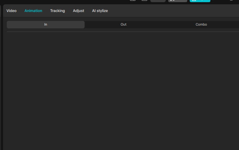 There's a bug on the Mac desktop version of CapCut where the 'In' tab under 'Animation' is empty. Existing animations in the timeline are still working.