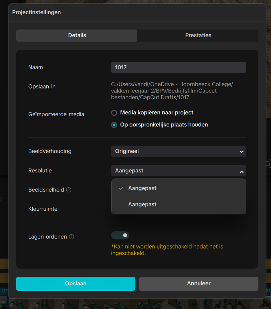 When checking the project settings, I noticed that the resolution under the “Details” tab is set to “Custom”, and it cannot be changed — the only available option is again “Custom.”