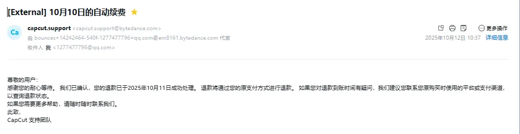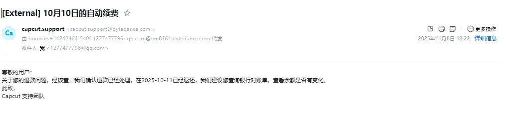 ✔ CapCut 邮件中“承诺退款”的书面证据