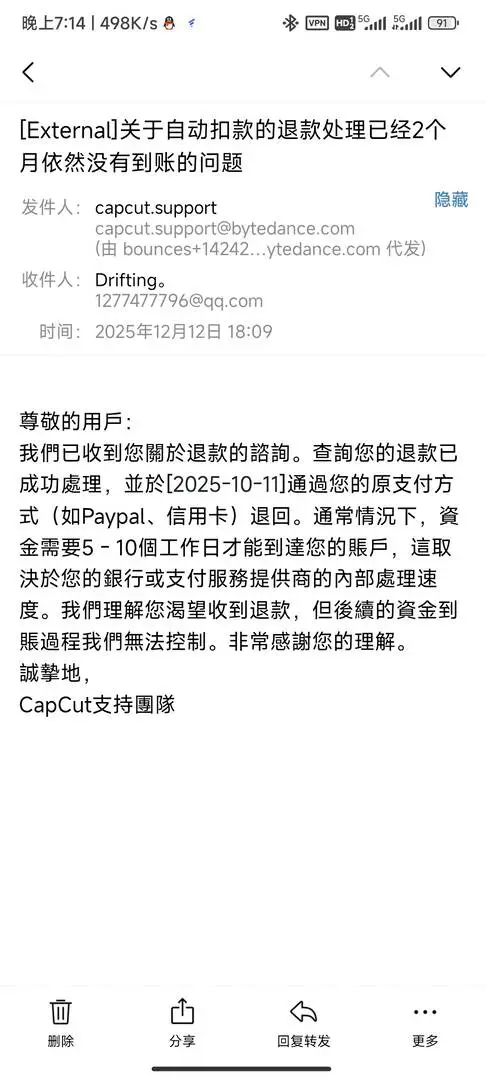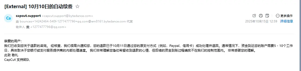2. 10月10日扣款后,你立即通过 PayPal 争议、Email 向 CapCut 申请了退款