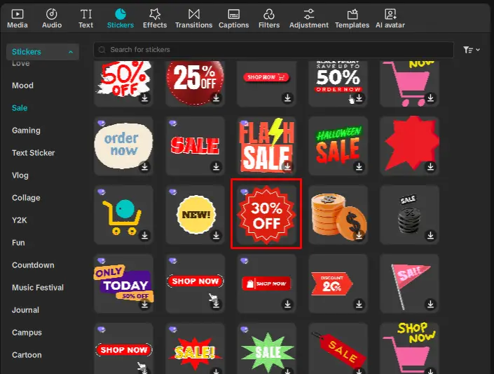 Most CapCut stickers cannot have their text edited, including the “30% OFF” one you highlighted.