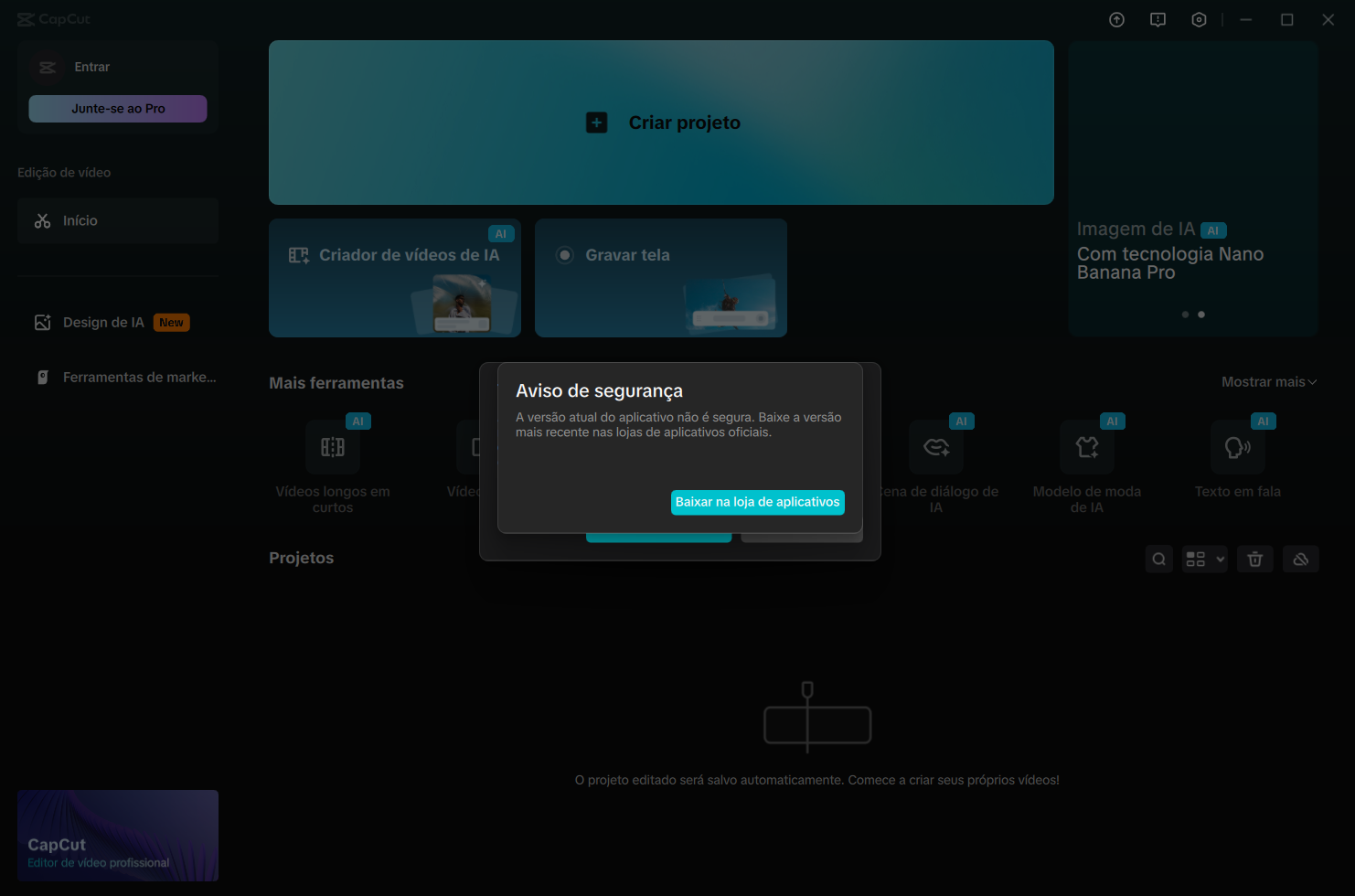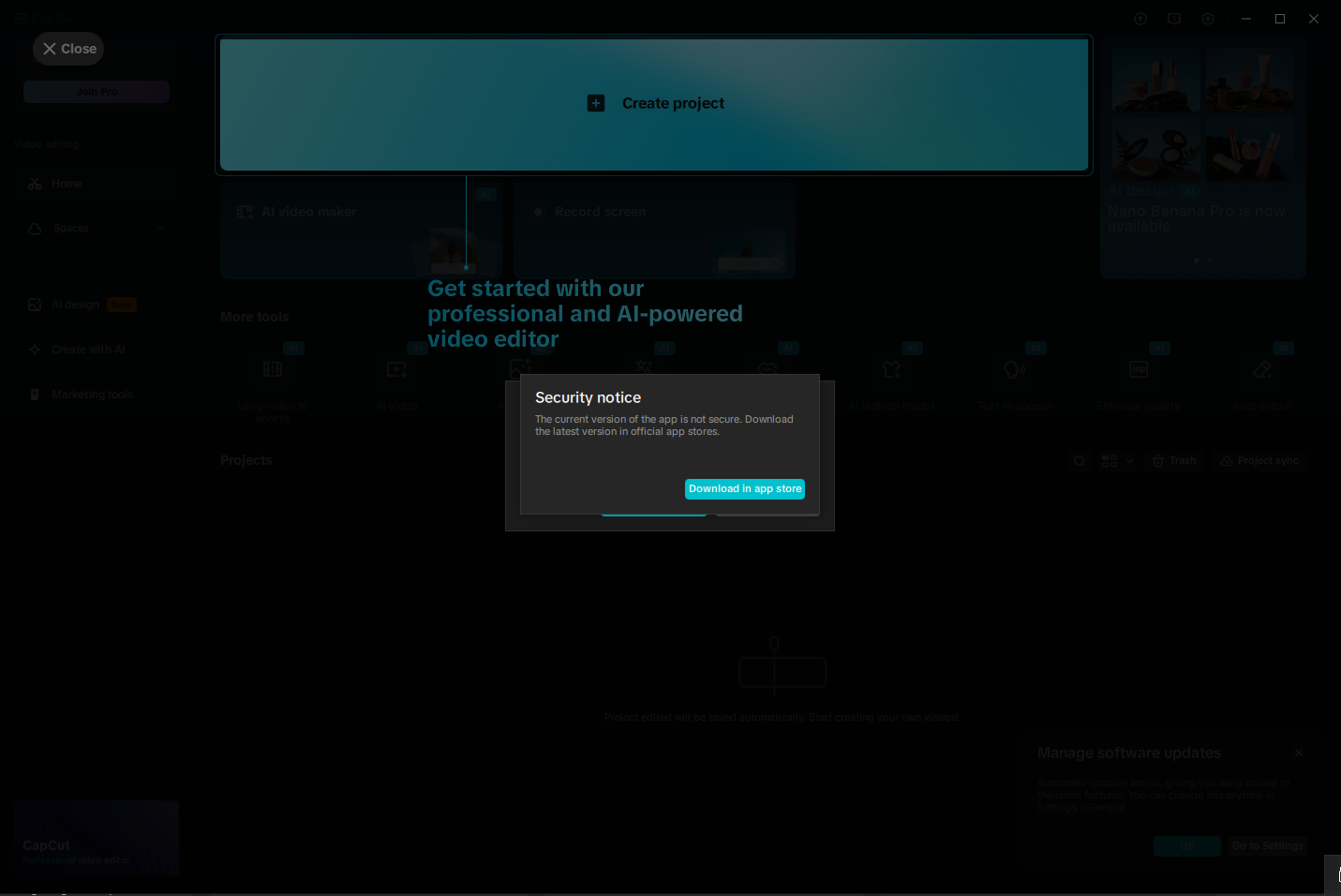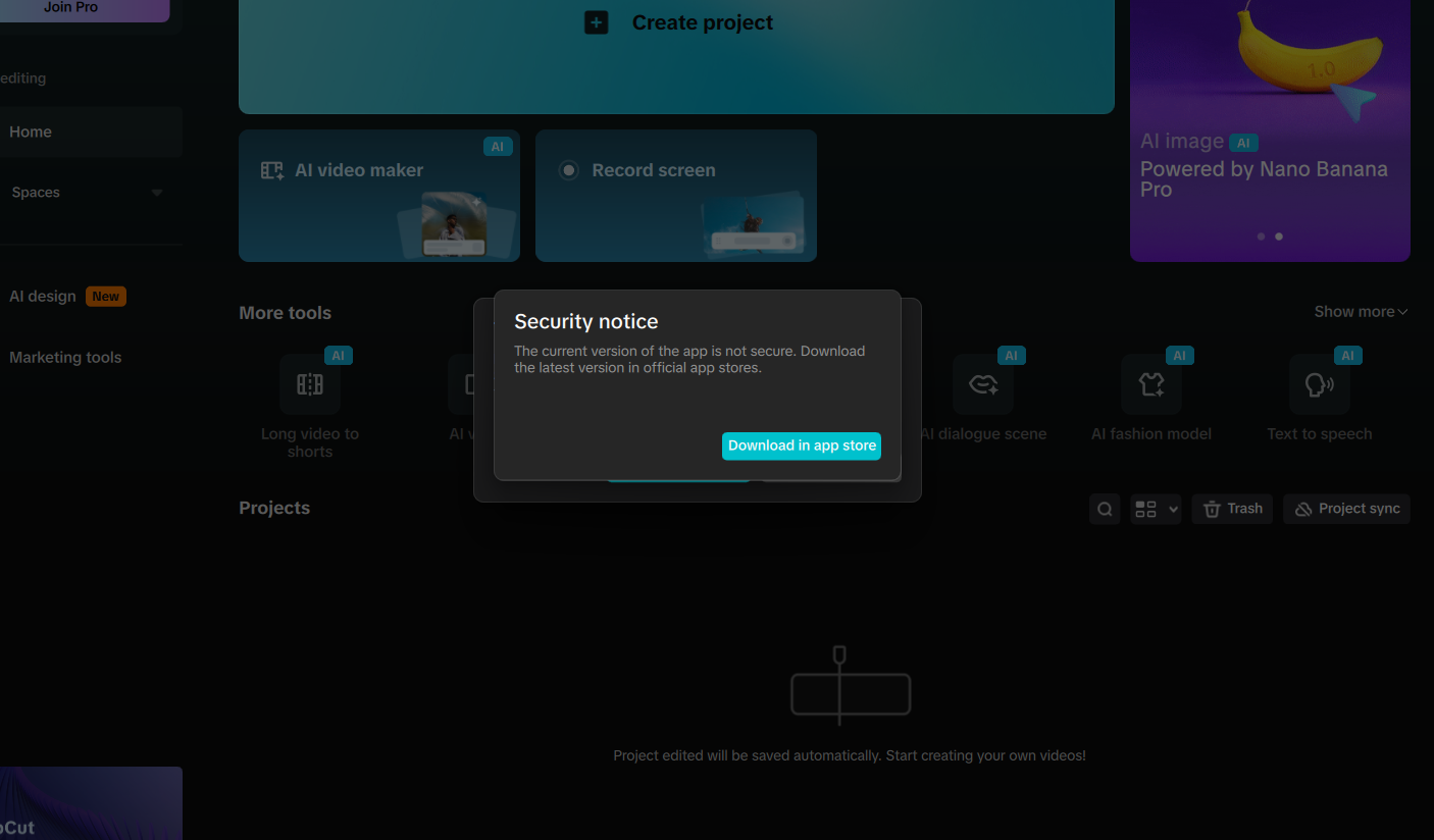 first im using capcut, is EXE version, theres no problem, but, this time, capcut wont let me using the software, ive try everything from the tips above, it didnt work, now im downloading from microsoft store, its the same, didnt work, im using pro package tho, can u help me? error messages say "the current version of this app isnt secure, download the latest version in official app stores."